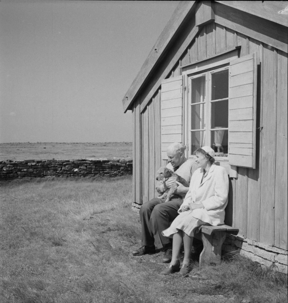 Titel: Fil dr Knut Hagberg (Svenska Dagbladet) interiör o exteriör, Hagbergs stuga på Alvaret. Hagberg själv