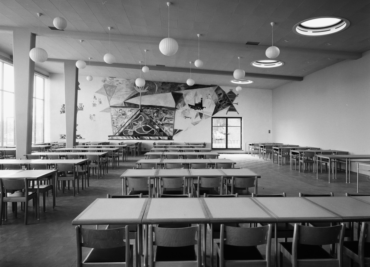 Interiör, matsal rader av bord under globlampor i taket, utsmyckad fondvägg