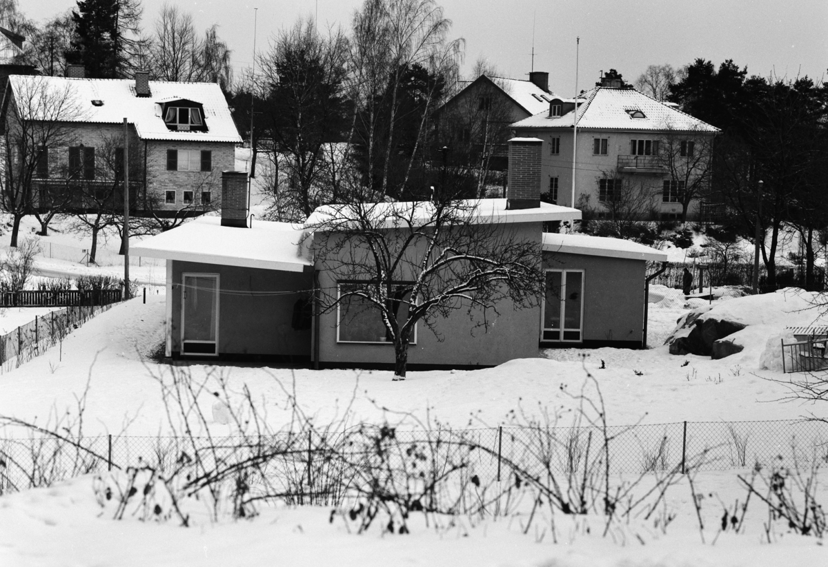 Exteriör, enplansvilla i vinterlandskap. Gavelfasad mot söder.