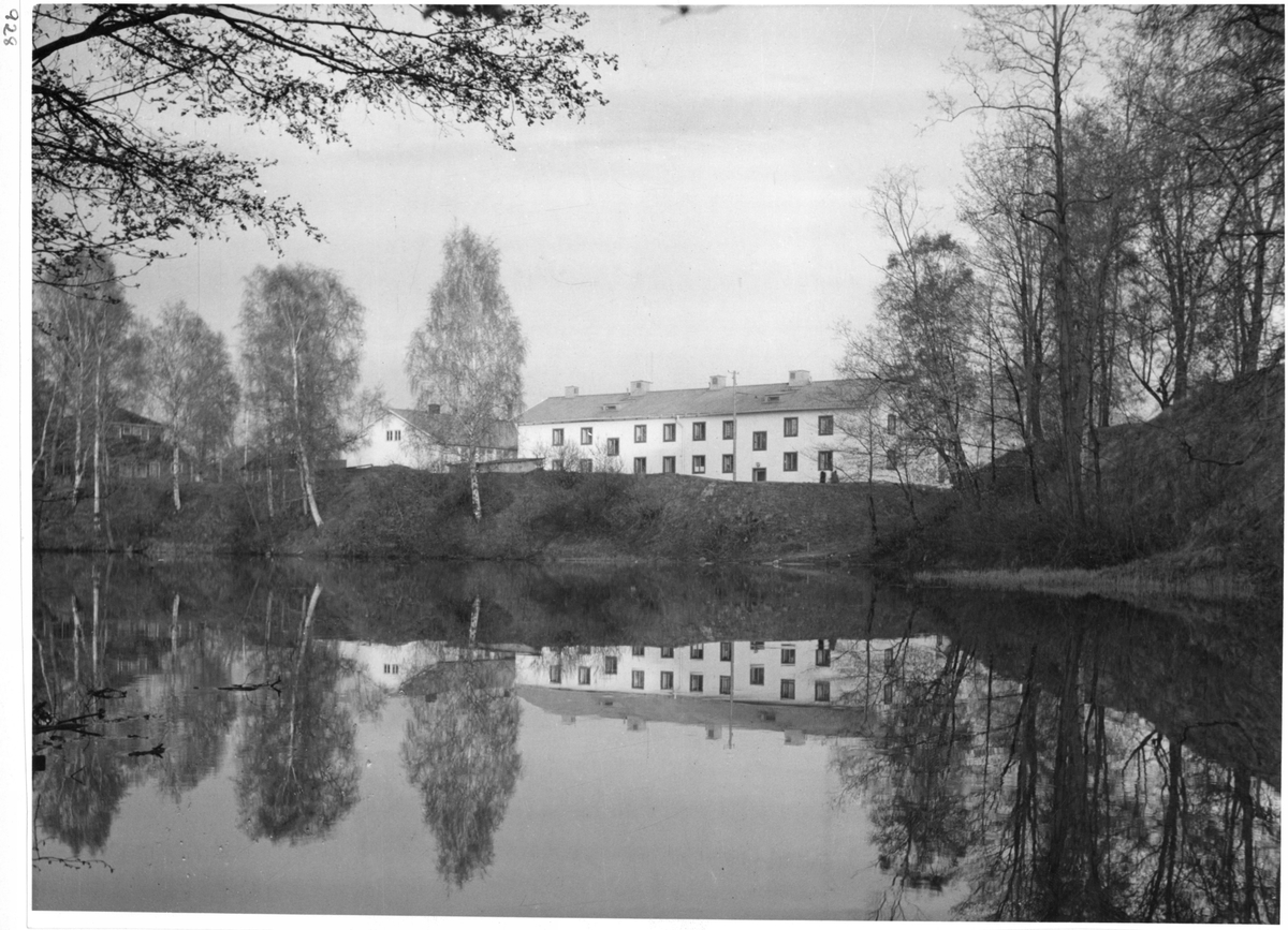 Titel: Vy över vattendrag mot byggnader i Sandviken Exteriör