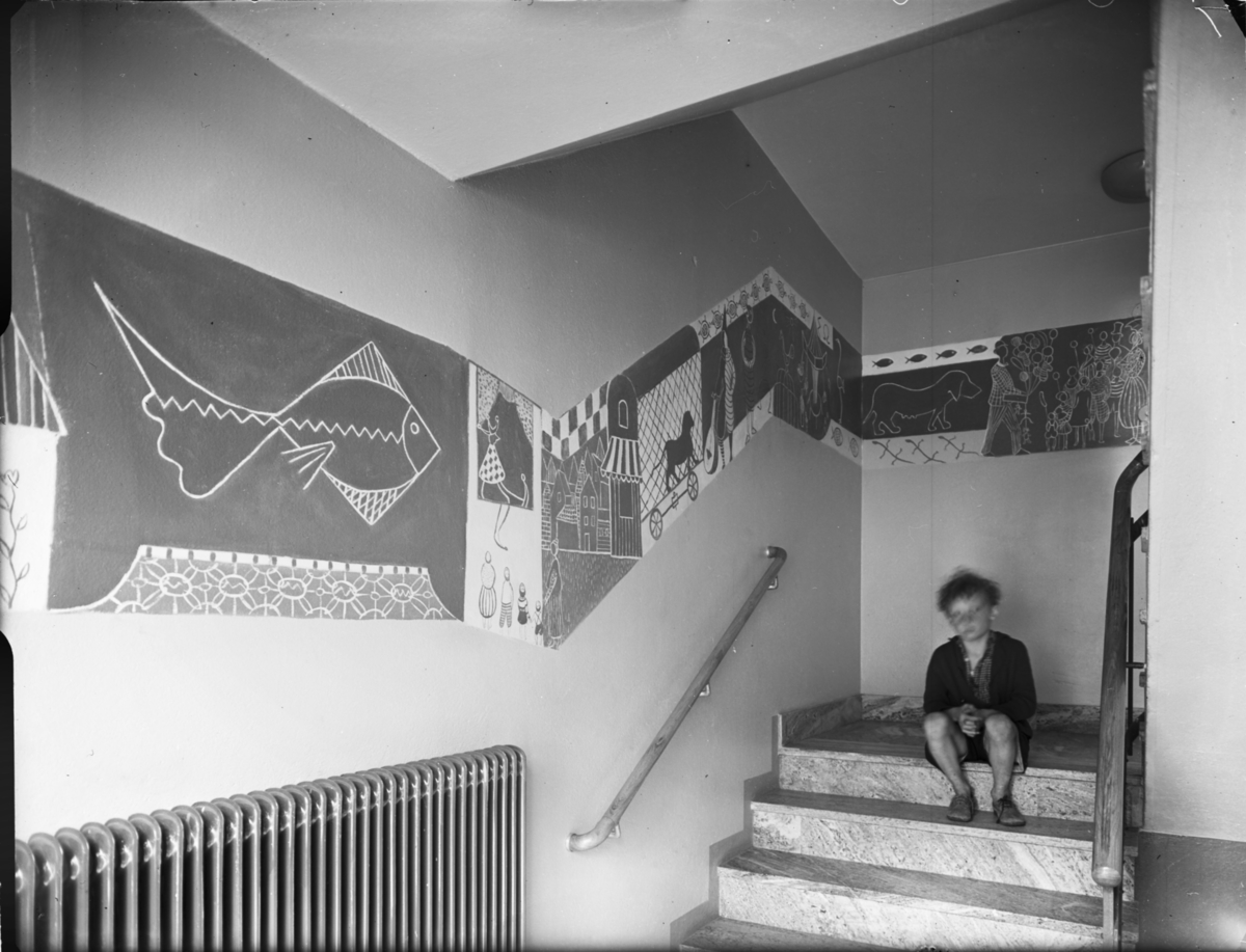 Väggmålning med tax, fisk och ballonger i trappuppgång, Hägersten