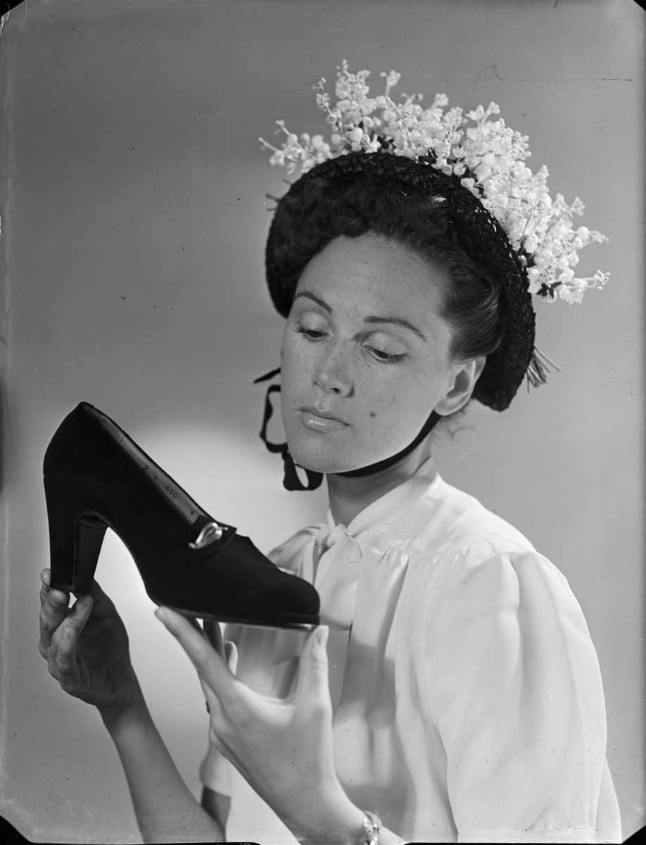 Kvinna med blomsterprydd huvudbonad håller upp en sko