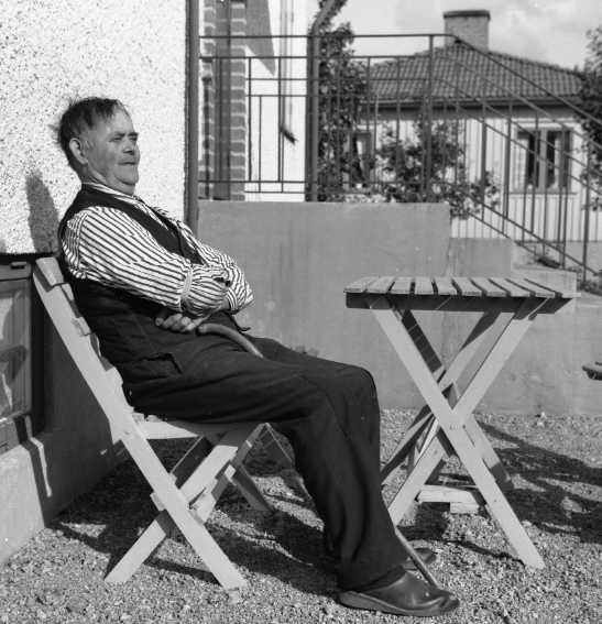 Titel: Man sittandes i trädgårdmöbler.