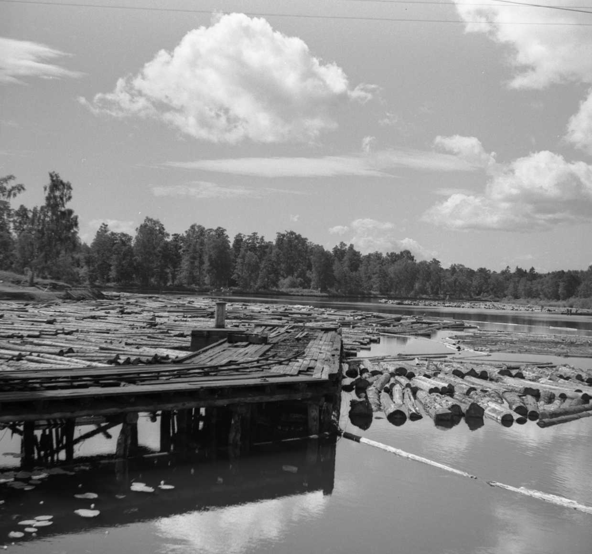 Titel: Förvaring av timmer till sågverket. Spikbryggan i förgrunden.