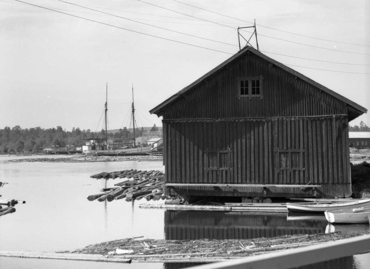 Titel: Forsviks bruks sjömagasin med sågenområdet skymtandes bakom.