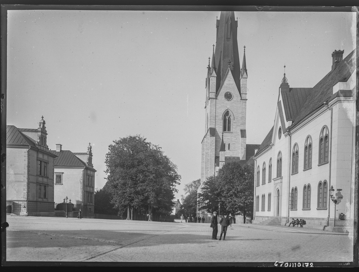 St Persgatan i Linköping. Man ser Linköpings domkyrka och slottet. Vy från Järntorget i Linköping.