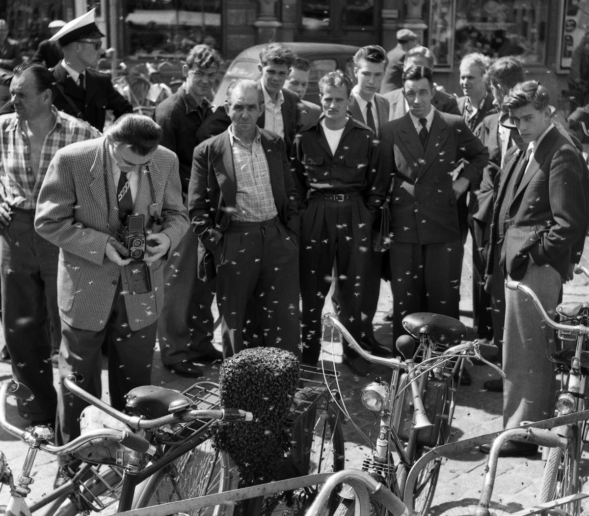 En bisvärm slog sig ner på en cykel i juni 1953 under värmeböljan. På bilden ser man även linköpingsfotografen Arne Gustafsson dokumentera händelsen. Östgötens rubrik den dagen var fyndigt nog "Bicykel".