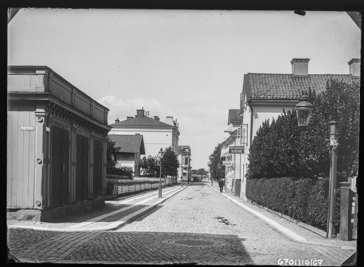 Platensgatan i Linköping. Hörnet mot Ågatan. Man se en skylt för Skräddare på bilden.