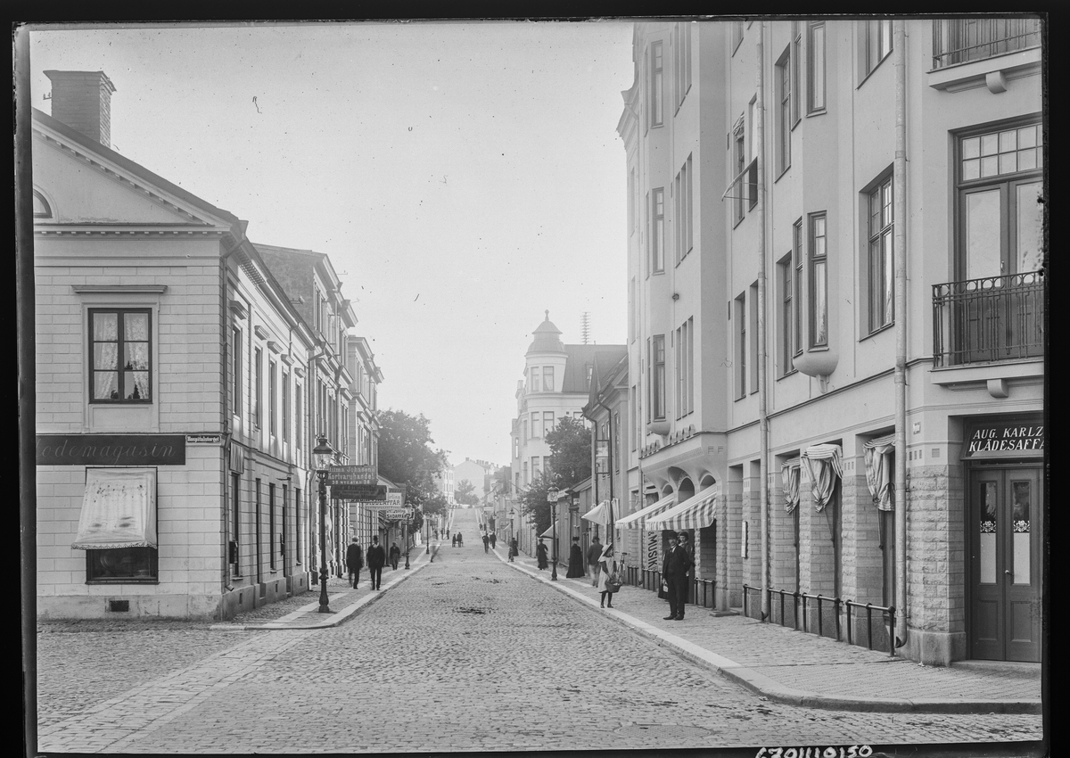 Nygatan i Linköping. Hörnet mot Hospitalstorget. Butiker och skyltar.