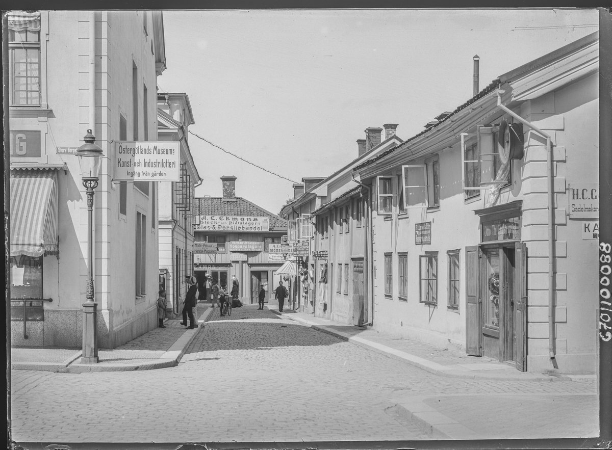 Hantverkaregatan i Linköping. Hörnet mot Stora torget. Man ser Östergötlands museum på bilden. i mitten av bilden ser man Ekmanska gården. Ekmans glas och porslin på Ågatan.