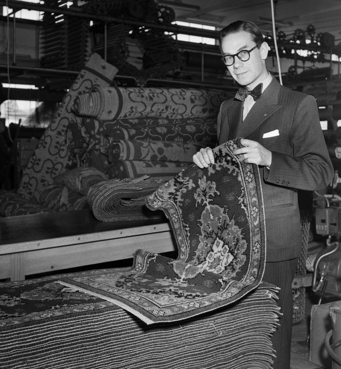 Direktör Olle Wahlbeck vd på Wahlbecks fabriker. Företaget, vars huvudprodukter var rep och mattor, hade 580 anställda. Wahlbecks grundades år 1877 som ett repslageri. Verksamheten växte och efter första världskriget inleddes tillverkningen av mattor.