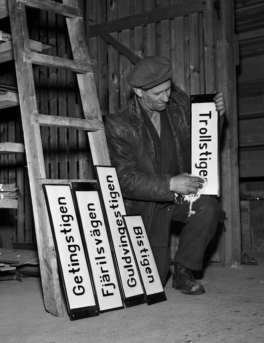 Kommunalarbetare Georg Karlsson förbereder uppsättningen av nya gatuskyltar runt villabebyggelsen i Ånestad. Trollstigen, Fjärilsvägen mm. Skylt.