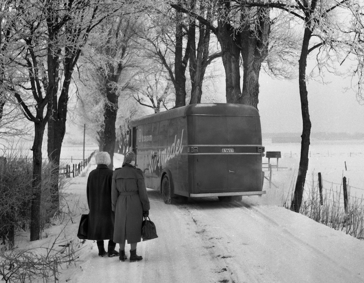 Livsmedelsbuss som rullade i Linköping 1951. Här är två damer vid Konsum på hjul. Matbutik. Matbuss. Allé.