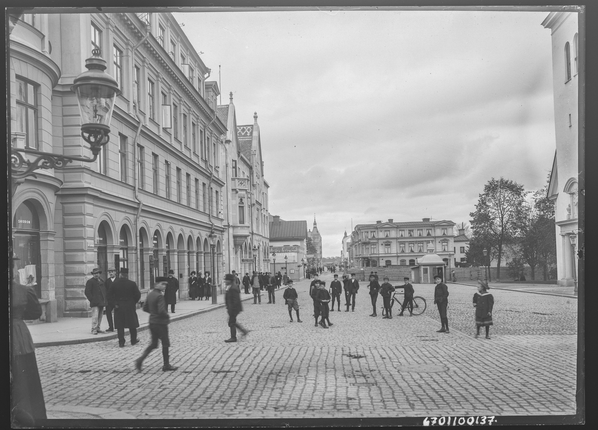 St Larsgatan i Linköping. Vy mellan St Larskyrkan och huset för Östgötabanken. Folkvimmel. Torg.