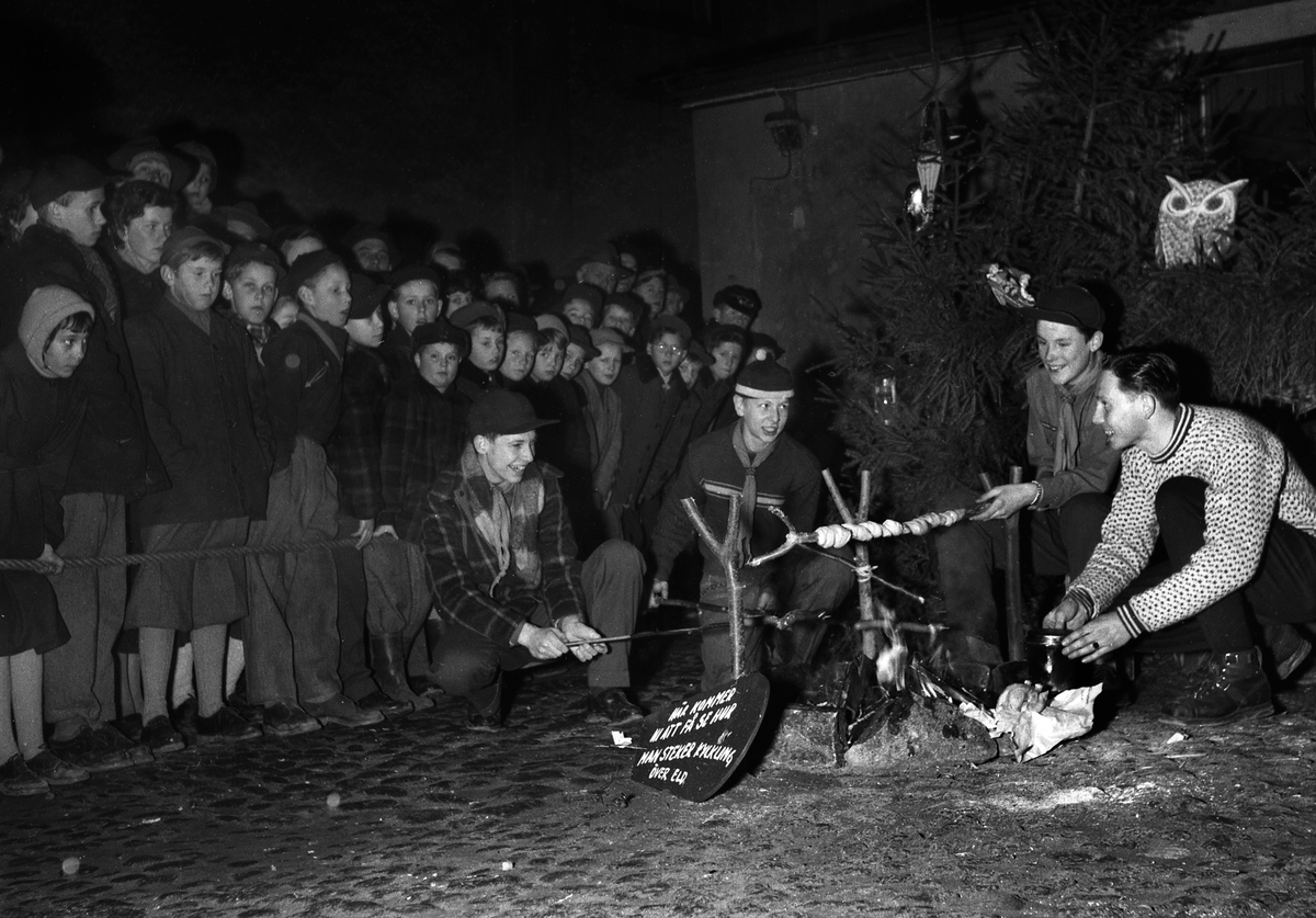 Scouter grillar, eller som det står på skyltem, steker korv och kyckling bakom församlingshemmet vid julskyltning 1954. Scoutverksamhet.