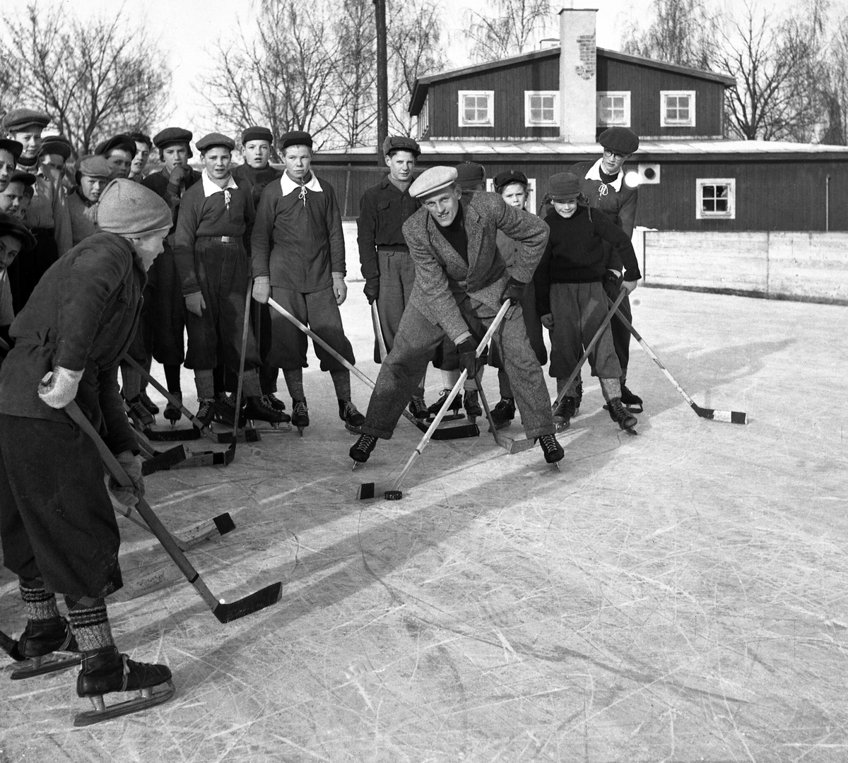 Bilden, från den 1 mars 1950, föreställer Sven Karlsson från Kenty som lär barn hur man ska hantera pucken. Hockey. Vintersport. Idrott.