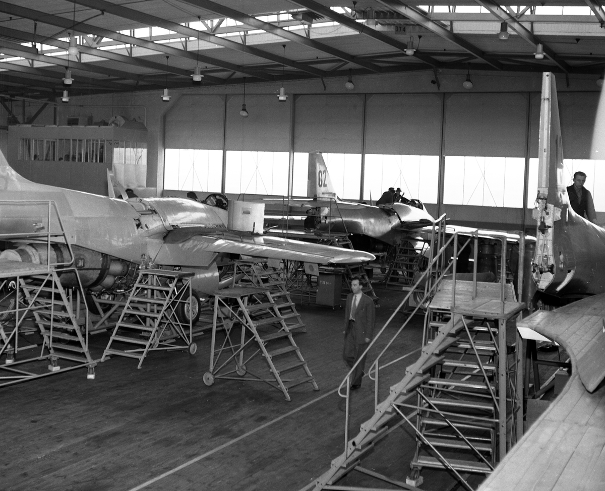 SAAb var motorn i Linköpings utveckling, med SAAB lyfte Linköping. Sedan mars 1939 hade SAAB sitt huvudkontor och konstruktionsavdelning i Linköping. Tillverkningen skedde i Linköping och i Trollhättan. Fotot visar interiören i stora monteringshallen på SAAB år 1951. ...