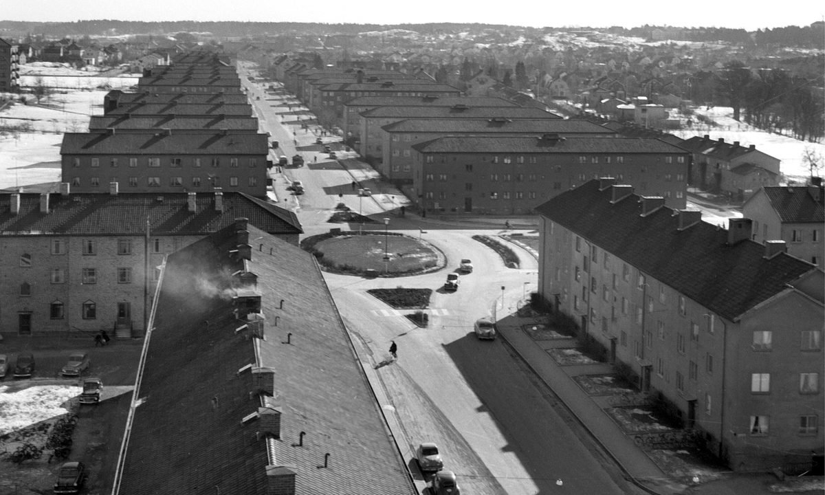 Utsikt från Kannans tak mot Nya Tanneforsvägen. Sommaren 1953 inleddes breddandet av Nya Tannerforsvägen i Linköping. Arbetet avslutades hösten 1954.