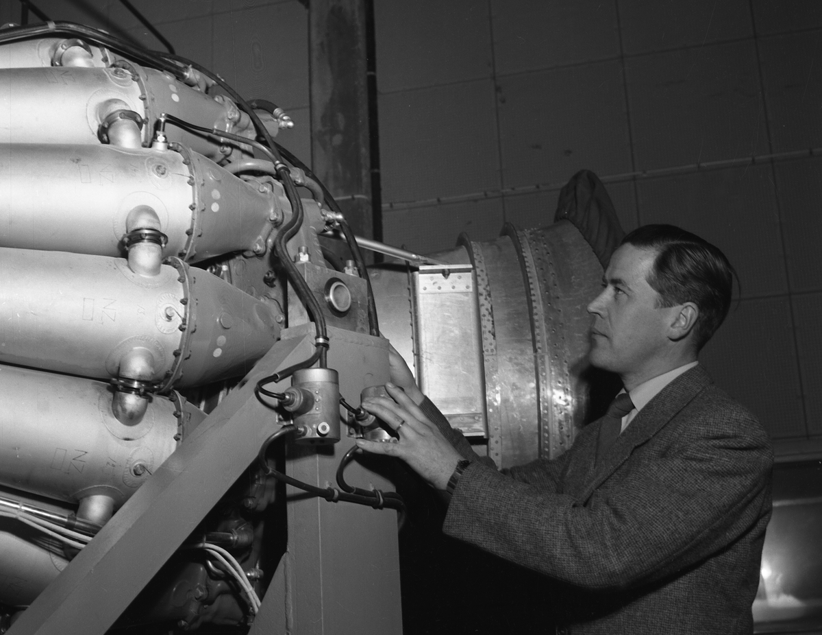 Ingenjör Tore Lindberg vid en av de fyra reamotorerna vid provkörningen vid Saabs reavindstunnel i februari 1952. Lindberg var ansvarig för installerandet av motorerna.
