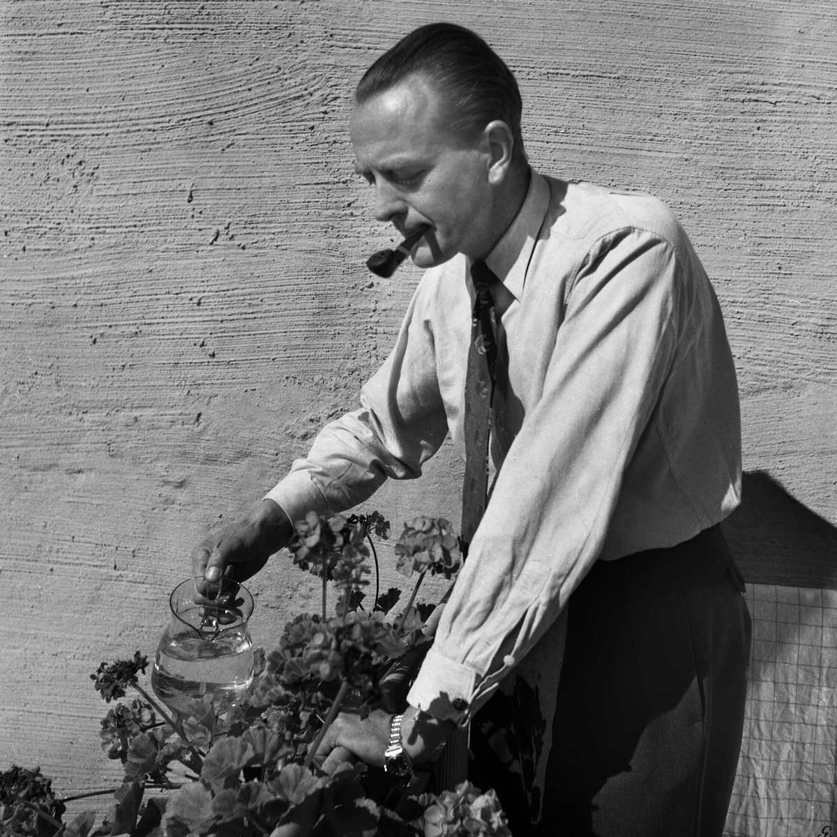 Gunnar Andersson vattnar blommorna på balkongen i Valla. Familjen hade även en kolonilott.