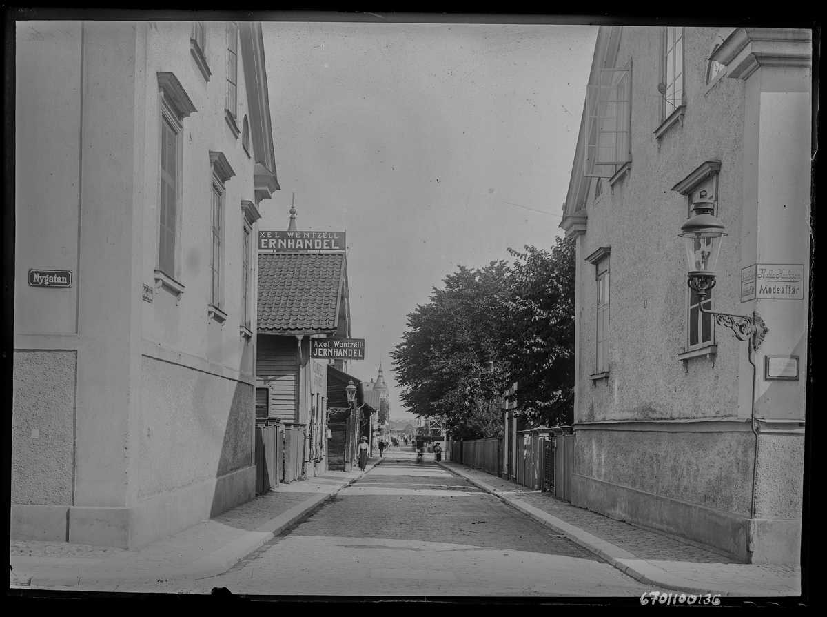 St Larsgatan i Linköping. Hörnet mot Nygatan. Axel Wenzell Järnhandel till vänster i bild.