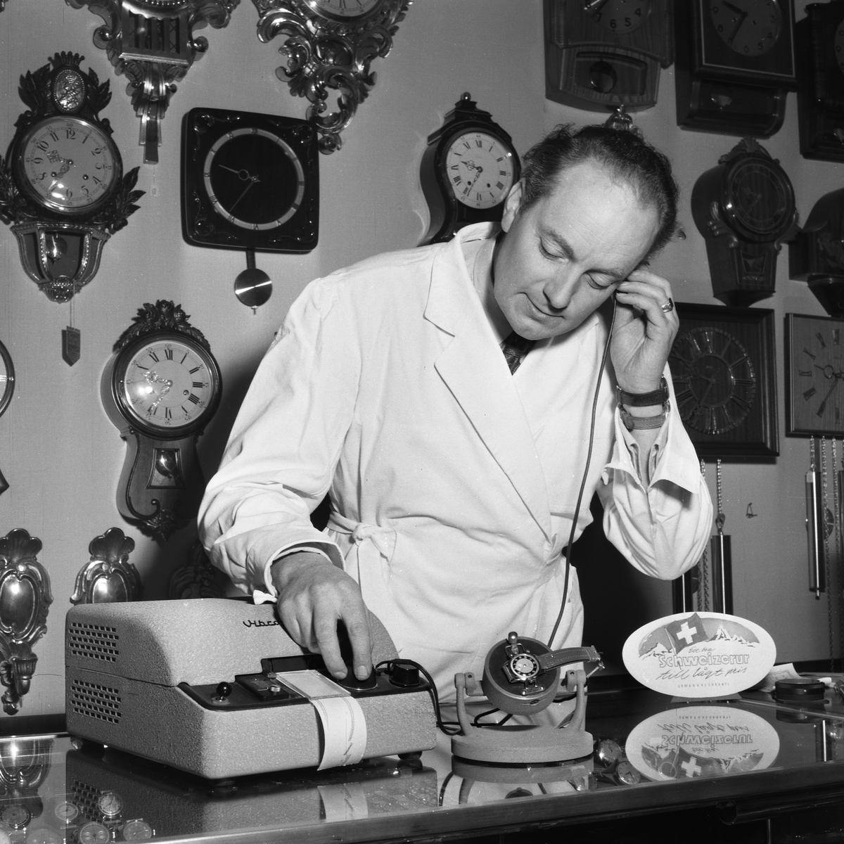 E G Rydfors i sin butik på Ågatan 32. Butiken säljer klockor. Han visar en vibrograf för fotografen. Vibrografen används för att se om en klocka stannat och hur länge tiden stått still via ett diagram. ...