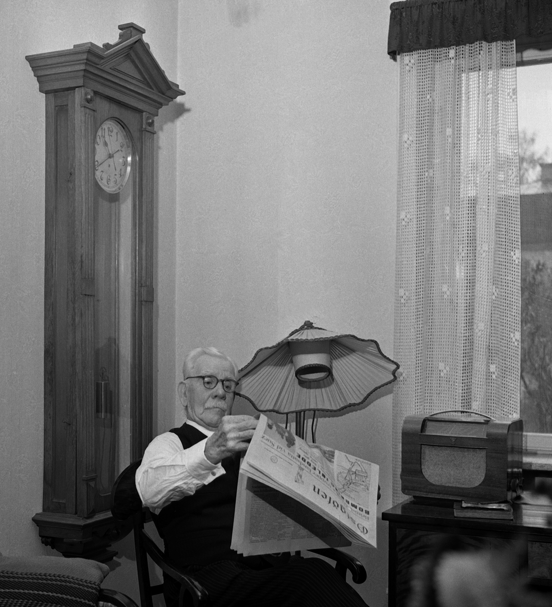 En man i en lägenhet som läser en tidning. Bakom ser man en stor klocka. Mannen läser tidningen Östgöten.