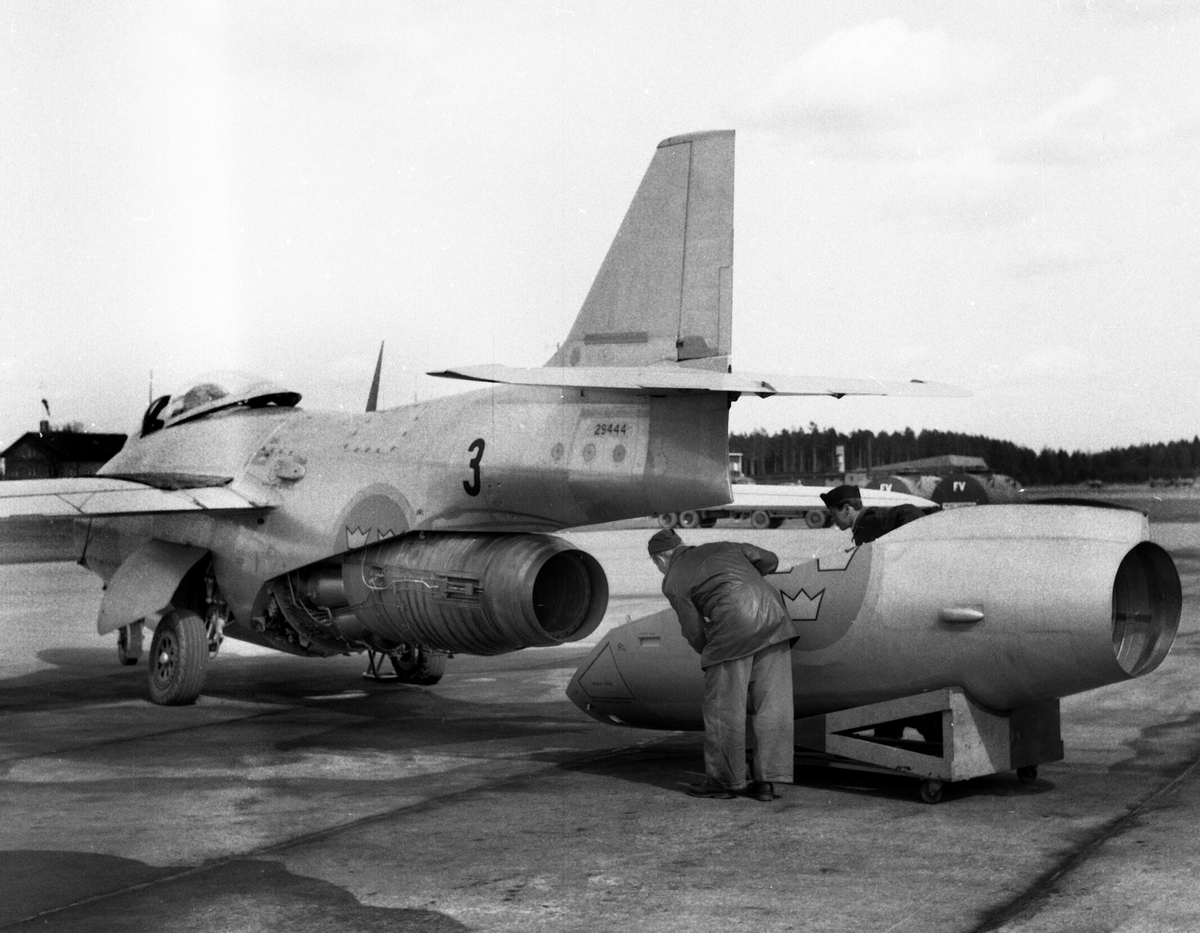 Förbandsprov med en ny version av J29 F Flygande Tunnan. Vid en pressvisning på Malmen framkom att planet motsvarade alla förväntningar. Det är major Georg Palmqvist och Gunnar Westerholm som ansvarade på pressvisningen.