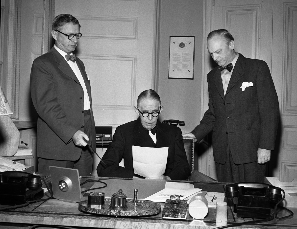 På bilden ser man Carl Hamilton i mitten med sina närmaste män landssekreterare Nils Rosenius och landskamrerare Harald Whitefield.