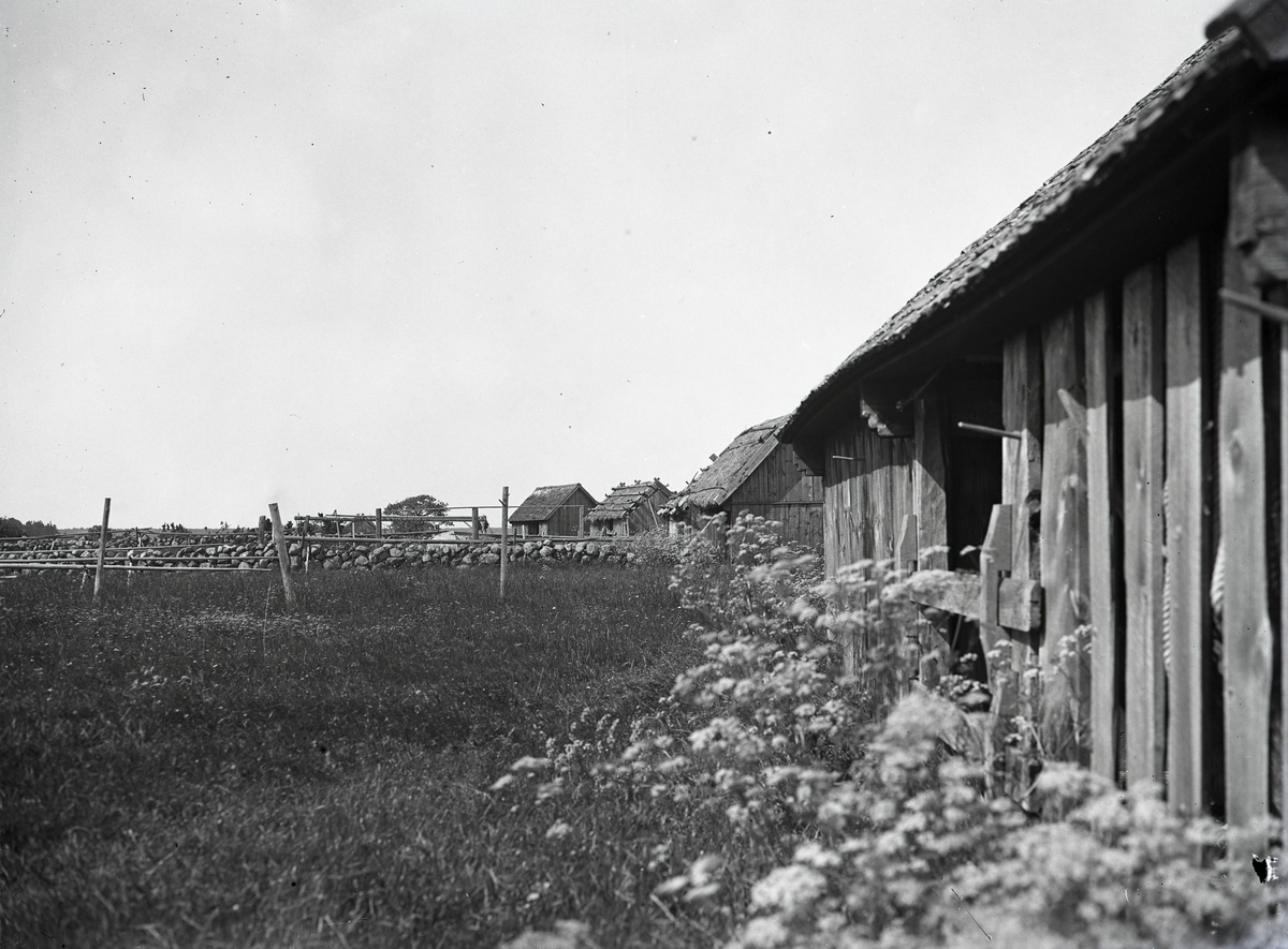 Böda hamn, sjöbodar i rad längs viken.