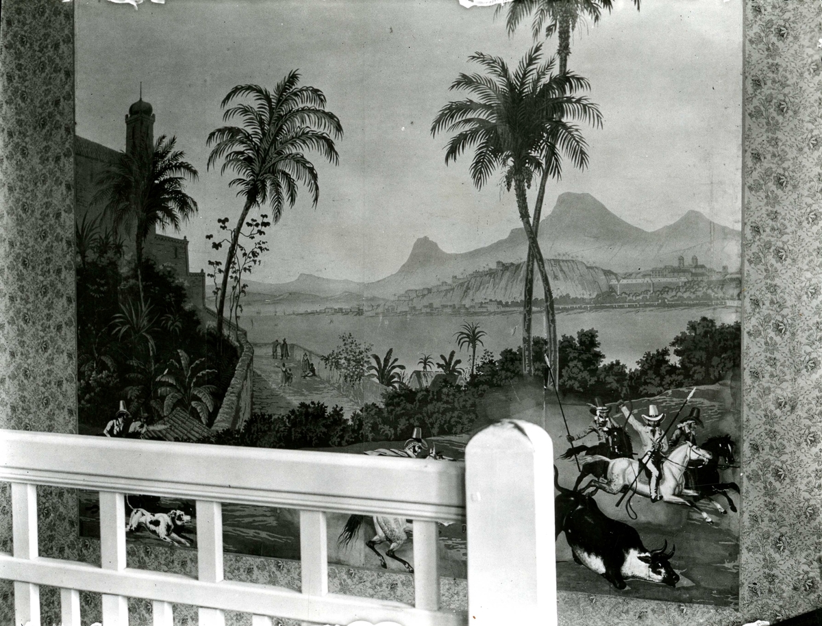 En målning i Stensberg med bland annat palmer och män som tjurfäktas, troligtvis i Karibien.