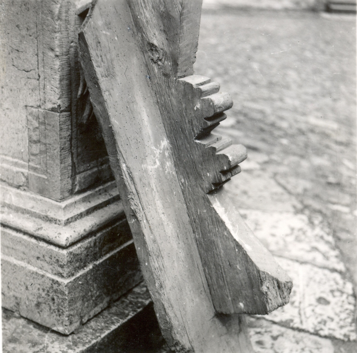 En gravsten med en träbit som är detaljsågad på Arby kyrka.