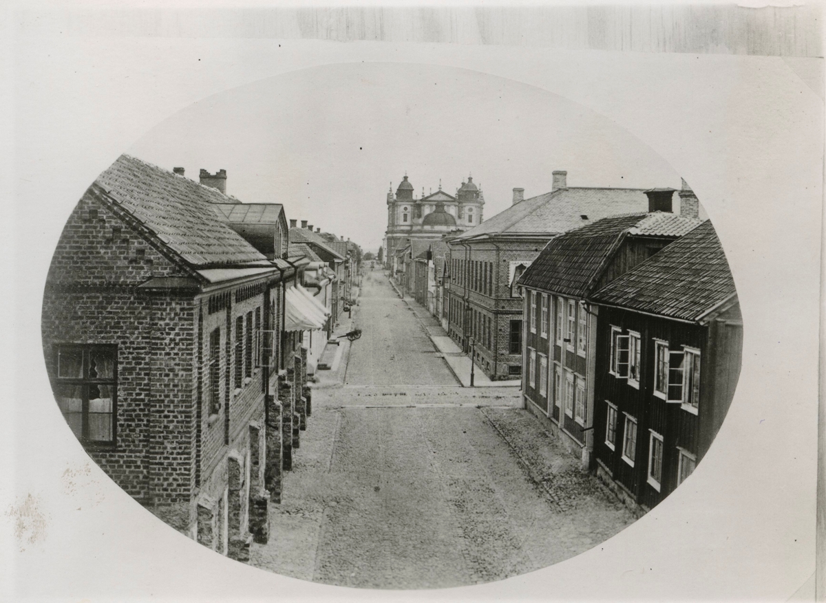 Kvarnholmen. Norra Långgatan omkring 1875. Första hörnhuset till höger Rektor Törnebladhs.