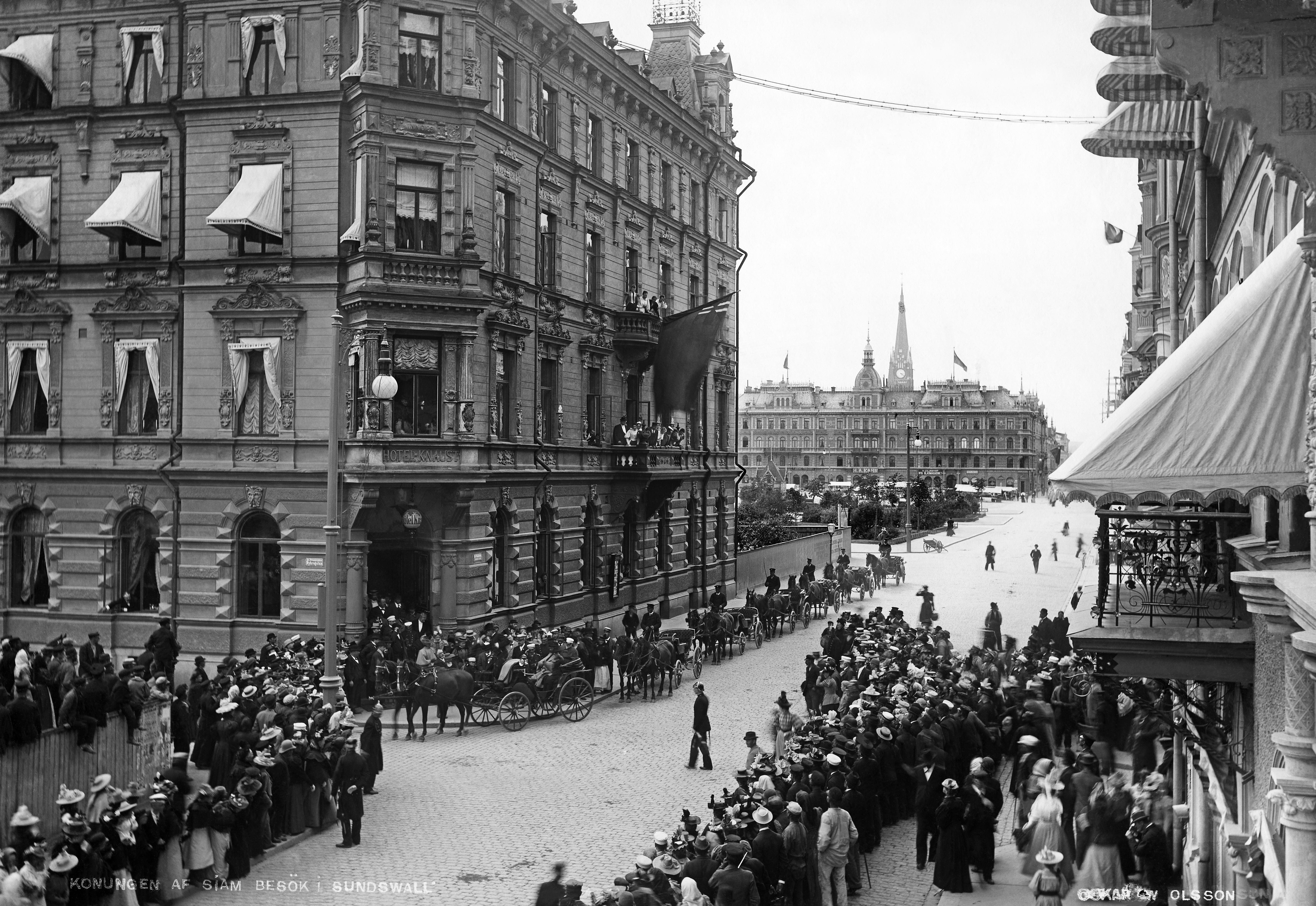 Beskrivning: Kung Chulalongkorn av Siam på besök i Sundsvall. Folksamling utanför hotell Knaust. Vy mot Stora torget. Foto ur tidskriften "Hemmet", 1898.