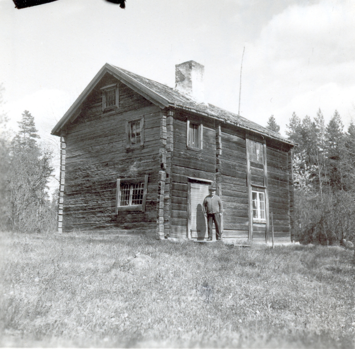 En äldre man framför dörren till ett knuttimrat hus i Sandliden.