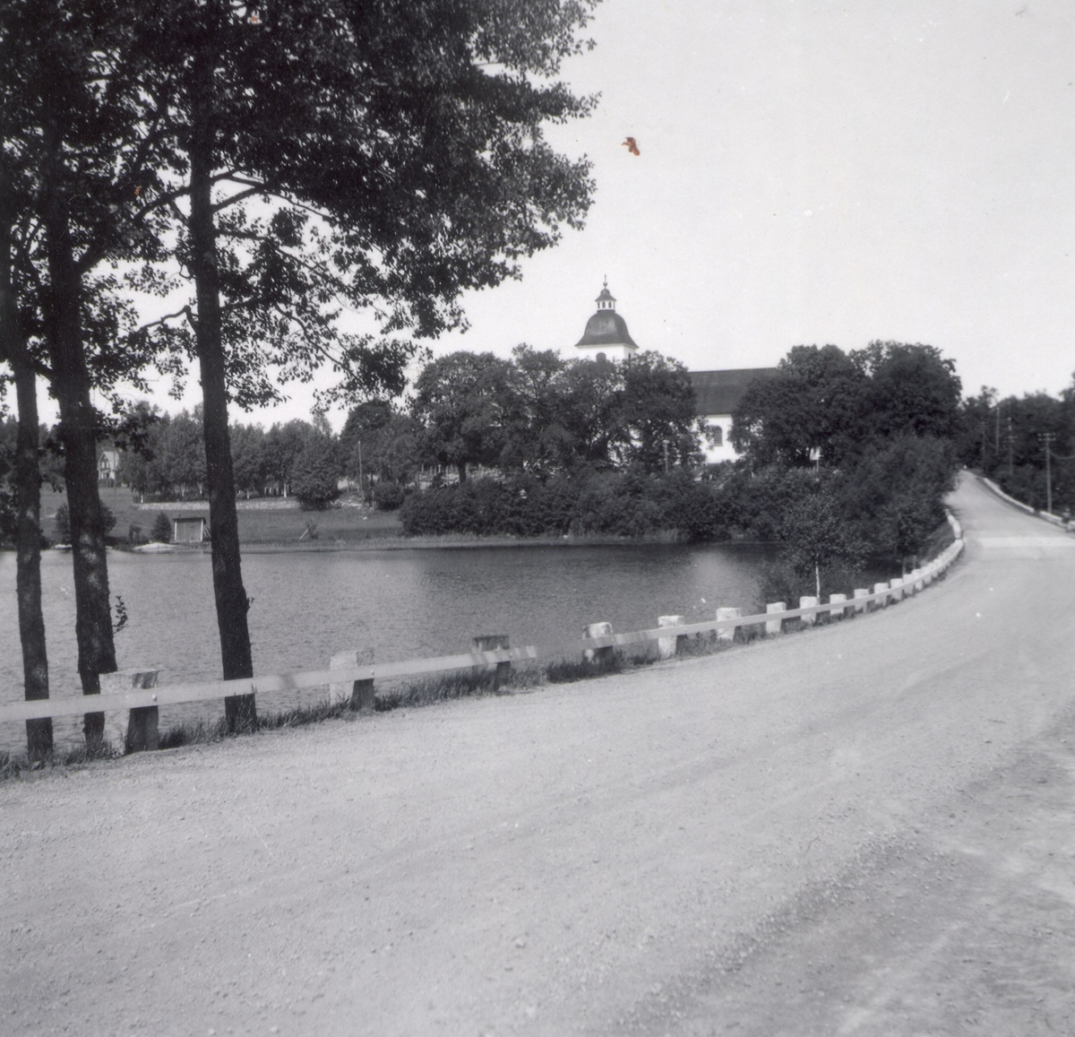 En väg med ett räcke bredvid en sjö. I bakgrunden syns kyrkan i Hjorted.