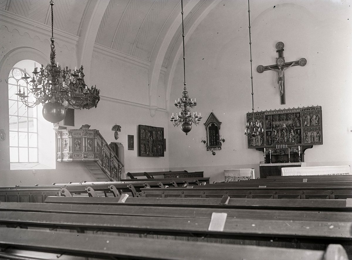 Interiör av Högsby kyrka med altarskåp, krucifix, psalmtavla och predikstol .