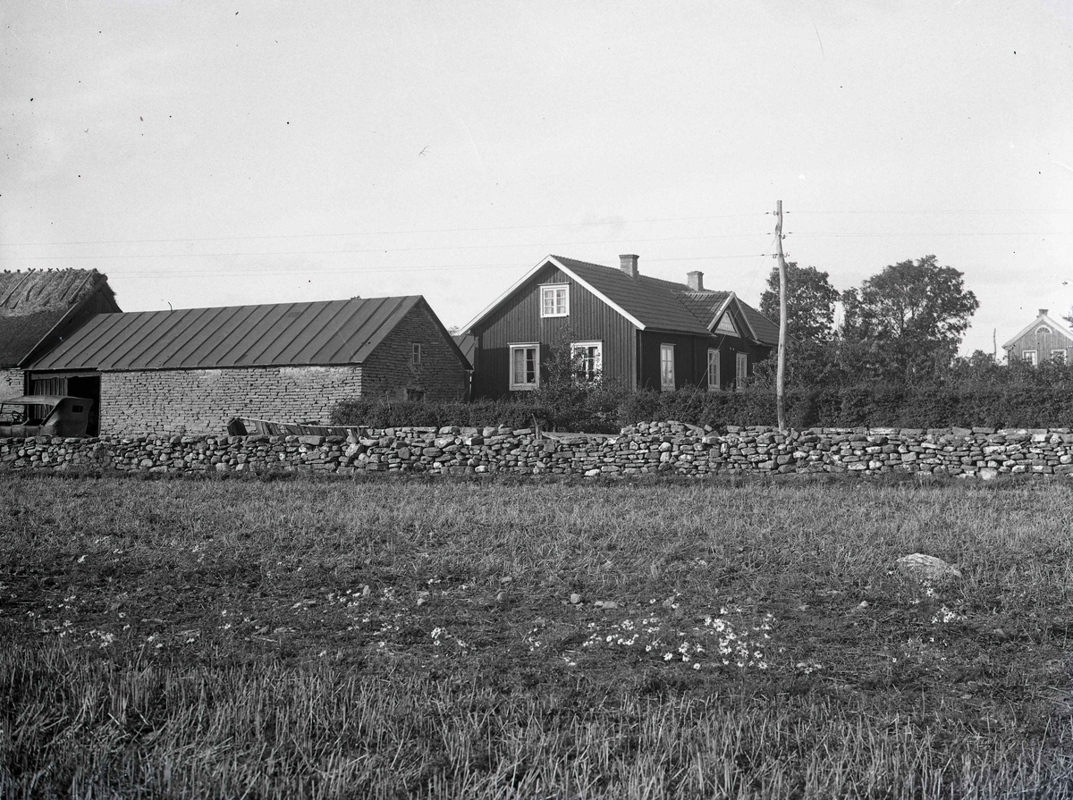 Åkermark och stenmur vid ekonomibyggnad och bostadshus.