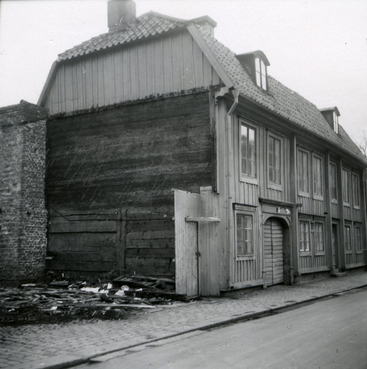 En rivningsområde och ett bostadshus med valmat mansardtak.