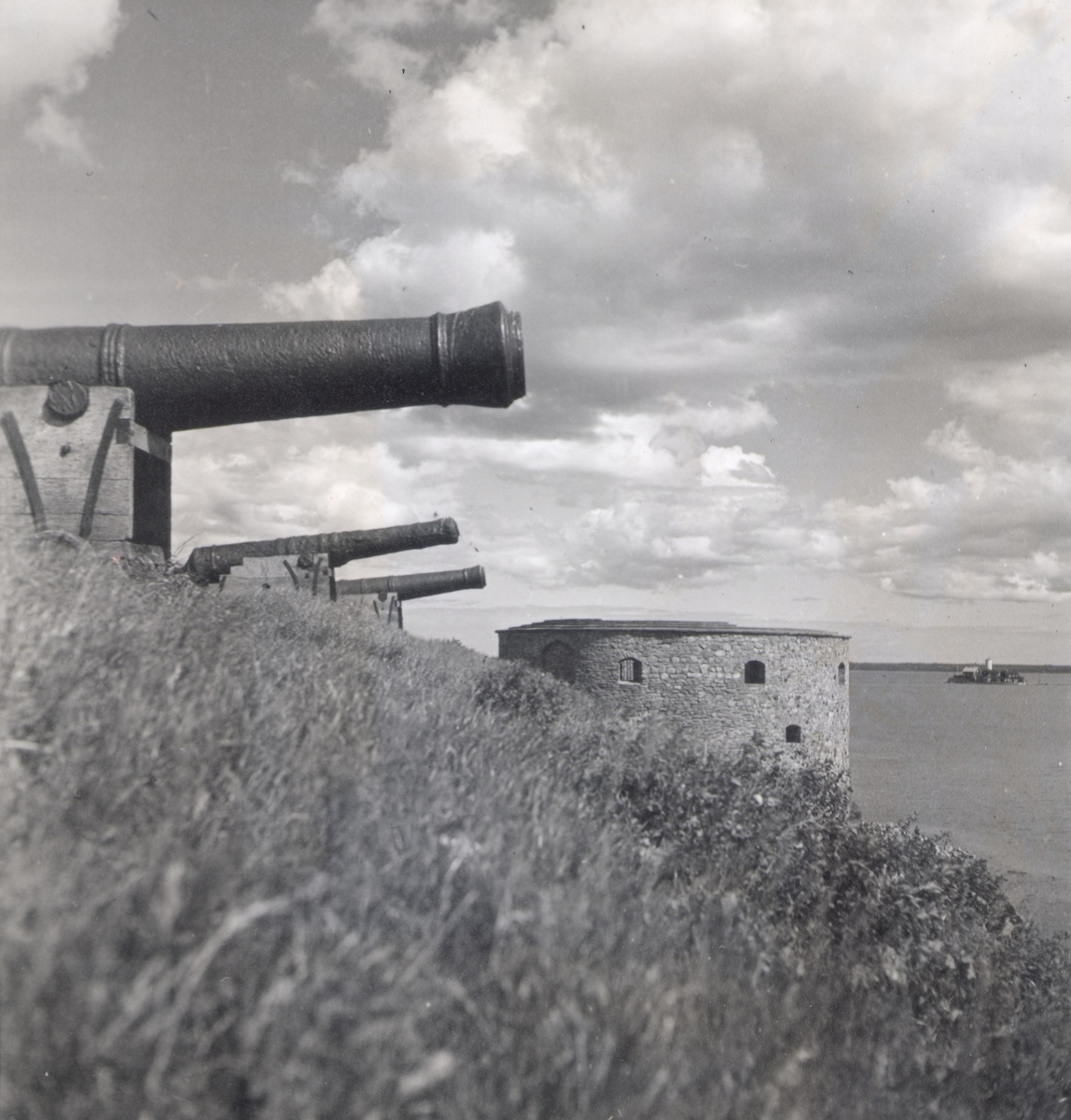 Kanoner på slottsvallen till Kalmar slott. En postej i bakgrunden.