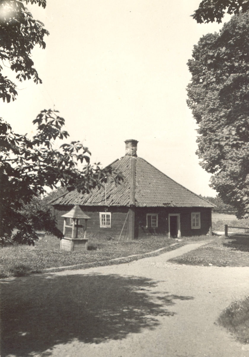 Byggnad med timmervägg, korsknutar och tälttak i Förlösa.