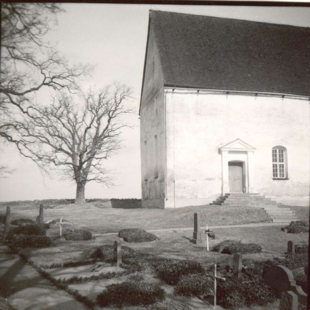 Kläckeberga kyrka. . Parti av kyrkogården med del av kyrkan i bakgrunden.