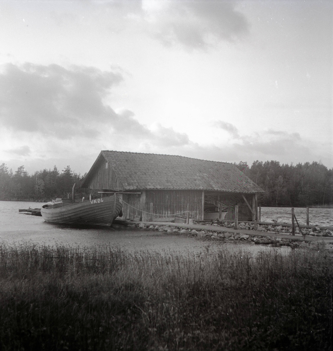 En förtöjd snipa utanför ett båtskjul i Västra Eknö.