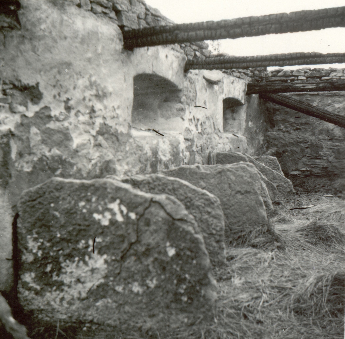 Bås, fönsternischar och bjälkar i en ladugård i Frösslunda.