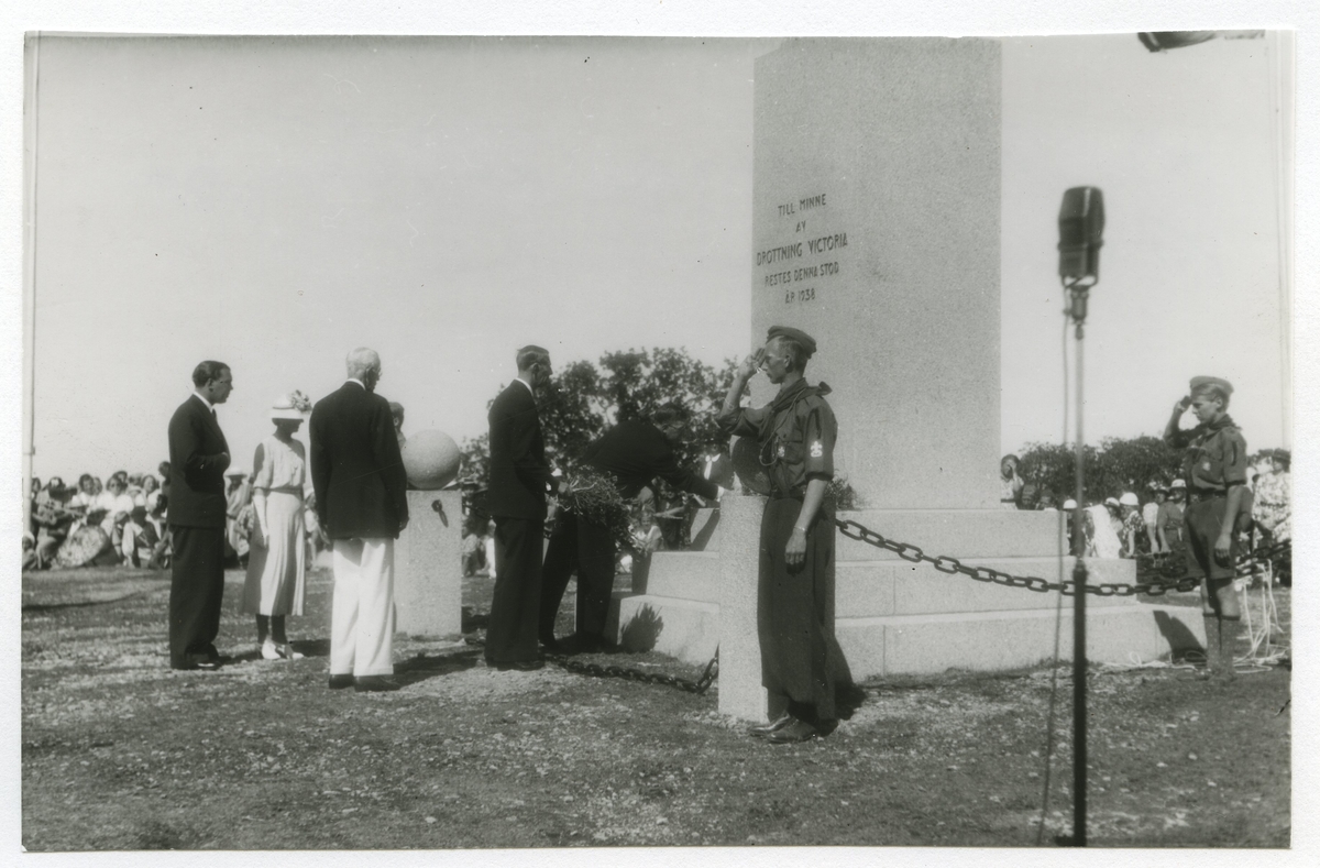De kungliga nedlägger sina blommor vid monumentet över drottning Victoria.