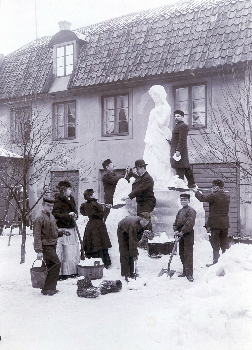 Anton Wahledow skulpterar i snö tillsammans med ett sällskap. Anton står högst upp och bilden är tagen på "Blomsterolles" innergård som ligger på Storgatan i kvarteret Åldermannen, Kalmar.
