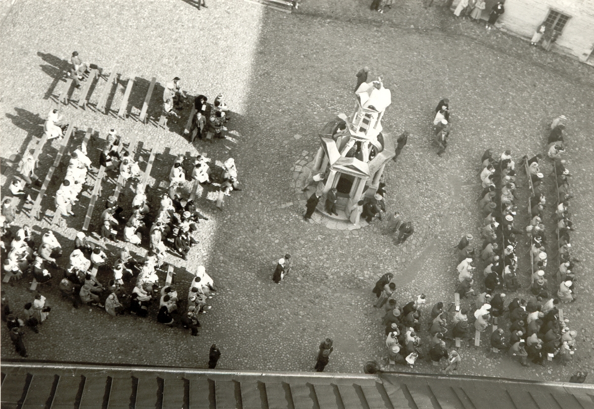 Folksamling runt brunnen på Kalmar slotts inre borggård.