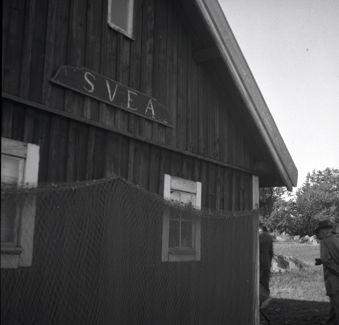 Motiv från Örö med en gavel, förmodligen på en sjöbod, med en namnbräda från ett fartyg; "Svea".