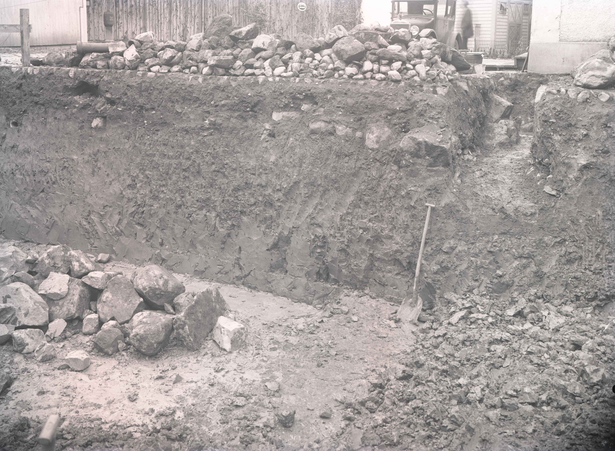Utgrävning å hotelltomten ca 1925. Spår av husgrunder och stenläggning.