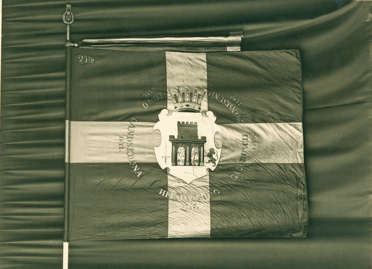 Kungliga Bohusläns regementes fana. Text på fanan: "Lund 1676. Landskrona 1677. Helsingborg 1710. Gadebusch 1712 Svenskesund 1790".